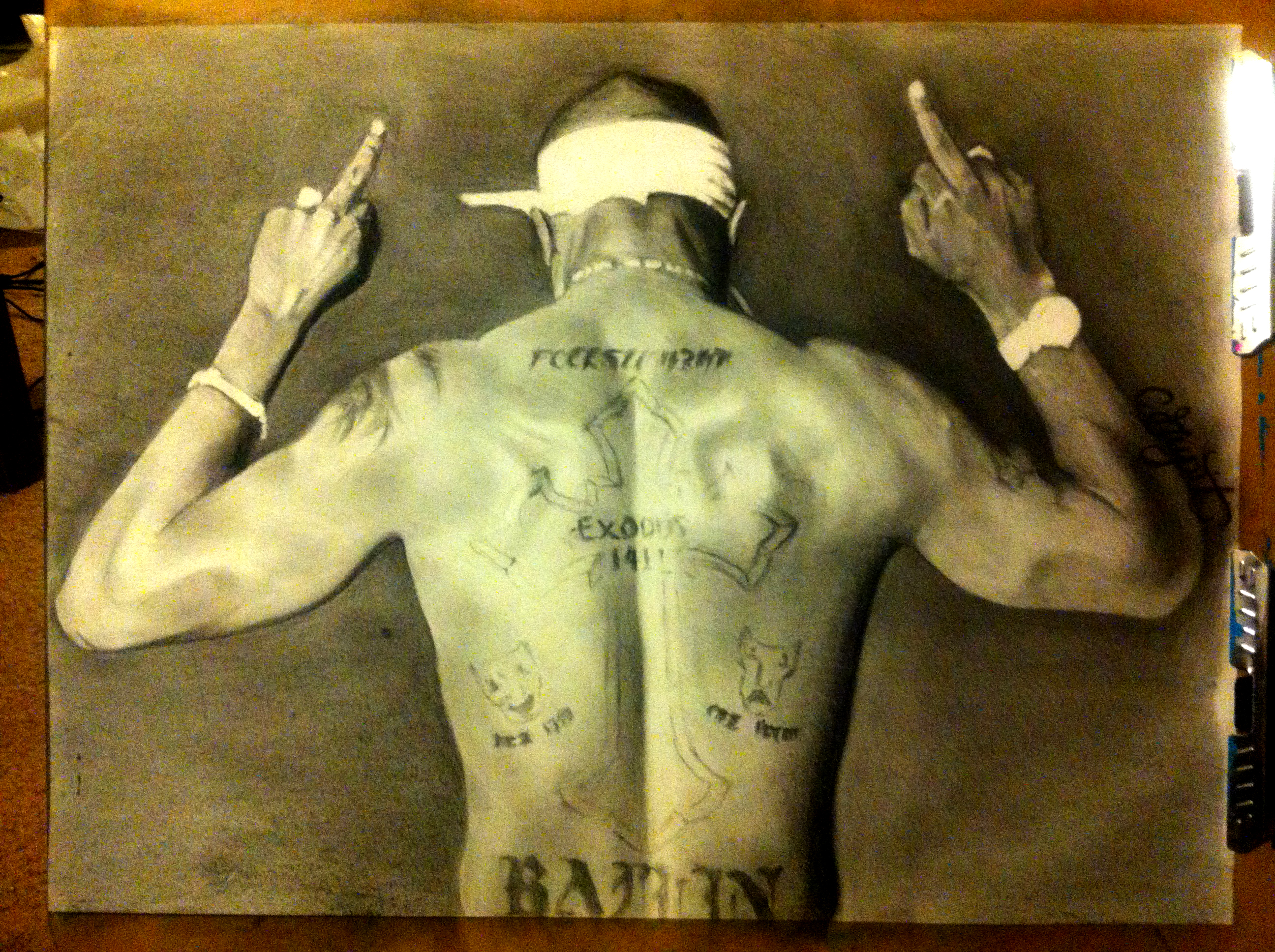 Just finished my charcoal drawing of Tupac Shakur. It’s charcoal on white 18x 24 paper. Haven’t posted anything in a while so I also added a tattoo design I did for my roommate. Thanks for looking!